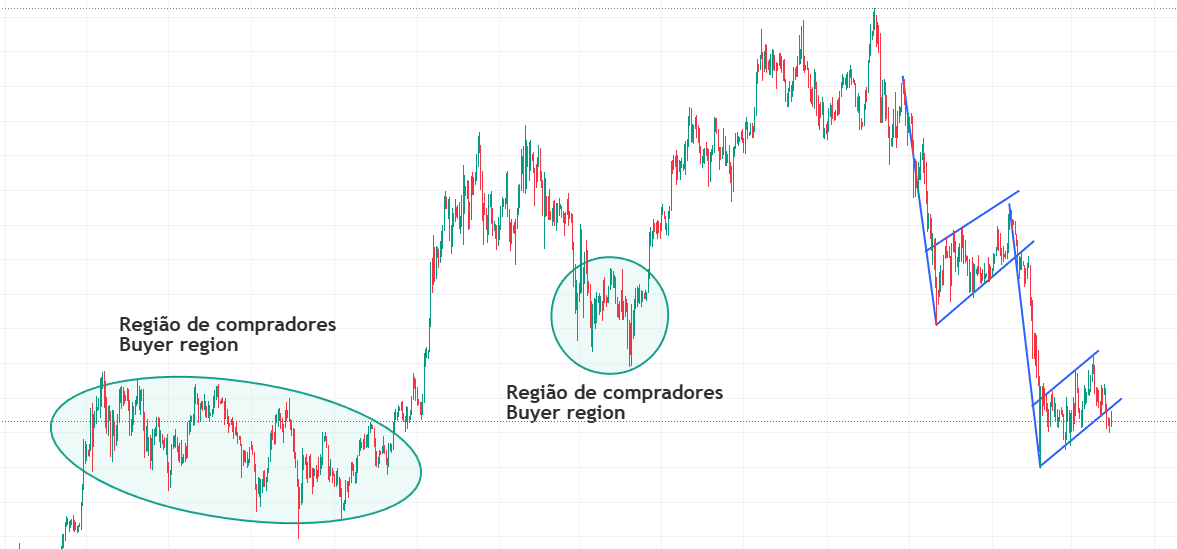 No entanto, há um ponto importante: essa bandeira está sendo formada em uma região de forte interesse comprador, onde historicamente houve entrada relevante de demanda. Esse fator gera um conflito técnico no gráfico, pois ao mesmo tempo em que o padrão sugere continuidade de queda, o suporte pode tentar segurar o preço.