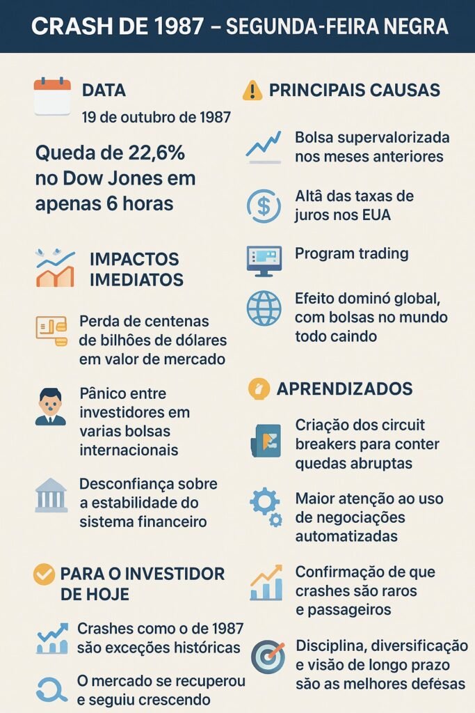 O Crash de 1987, também chamado de Segunda-Feira Negra (Black Monday), foi um dos episódios mais marcantes da história do mercado financeiro. Em 19 de outubro de 1987, o índice Dow Jones caiu 22,6% em apenas seis horas, configurando a maior queda percentual diária já registrada na bolsa de Nova York.