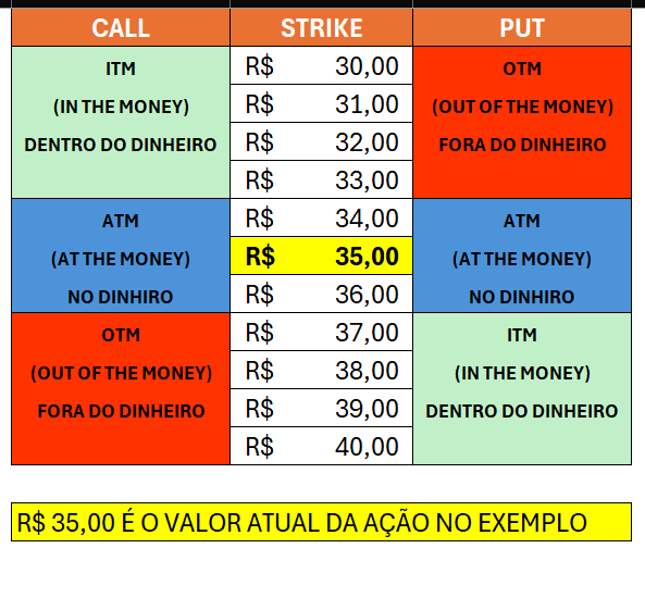 No mercado de opções, é comum ouvir expressões como ITM, ATM e OTM. Esses jargões indicam o valor intrínseco de uma opção em relação ao preço atual praticado no mercado do ativo-objeto (como uma ação ou índice).