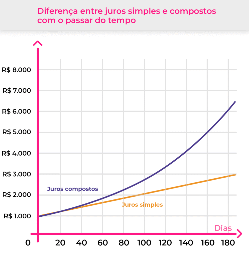 Aqui o rendimento cresce a cada mês, pois os juros passam a render MAIS juros.