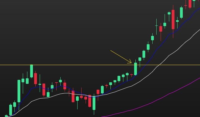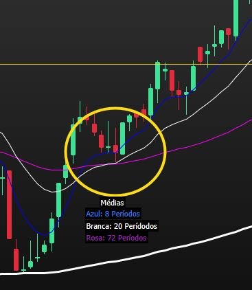 Quando uma média curta (como a de 8 períodos) cruza uma média longa (como a de 71 períodos), pode indicar o início de uma nova tendência. Esse setup pode ser combinado com outros, como pivôs ou rompimentos, para aumentar a taxa de acerto.