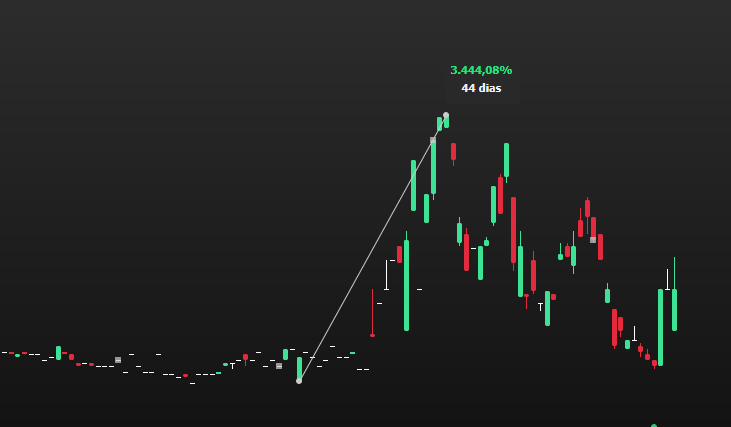 Na imagem, vemos a liquidez aumentando com o passar o tempo e uma valorização de mais de 3 mil e 4 centos por cento. A região anterior, foi uma acumulação, depois vemos uma valorização.